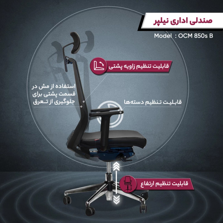 این مدل صندلی نیلپر همه ویژگیهای یک صندلی اداری استاندارد را دارد. صندلی مدل OCM 850s بر اساس اصول ارگونومی طراحی شده است بنابراین در هنگام استفاده از آن احساس راحتی خواهید داشت. همچنین شما میتوانید قسمت گودی کمر را با توجه به وضعیت بدنیتان تنظیم کنید. استفاده از روکش مش برای جلوگیری از تعریق و قابلیت چرخش در جهتهای مختلف از دیگر ویژگیهای مثبت این صندلی اداری باکیفیت هستند. در ساخت پشتی و قسمت نشیمن صندلی اداری نیلپر مدل OCM 850sاز پلی آمید تقویتشده استفاده شده است تا مقاومت و طول عمر صندلی بیشتر شود. همچنین قسمت سری قابل تنظیم است و امکان تغییر ارتفاع و حرکت به سمت جلو و عقب را دارد. روکش قسمت نشیمن از جنس پارچه و پایه صندلی هم از فلز ساخته شده است. شما با خرید این صندلی تا مدتها نیازی به یک صندلی اداری جدید نخواهید داشت.